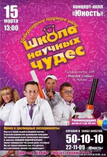 Школа научных чудес — полуфиналист шоу Минута славы на Первом канале. Это единственное в Украине научно-популярное шоу для всей семьи, которое доказывает, что наука — это весело и интересно!