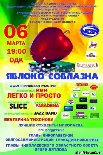 При поддержке Управления образования и науки Украины, управления по делам семьи детей и молодежи облгосадминистации и горисполкома пройдет конкурс лучшей студенческой пары города - "Яблоко соблазна".