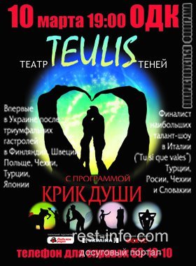 Театр Теней Teulis доказывает, что все фантазии можно притворить в жизнь с помощью теней человеческого тела. Вы окунетесь в завораживающие шоу и захватывающую дух хореографию, которые с легкостью пленят Ваше сердце... За последние 4 года Театр Теней Teulis был финалистом крупнейших талант шоу в Италии, Турции, России, Чехии и Словакии. Гастролировал в Финляндии, Швеции, Польше, Чехии, Турции. Совсем недавно театр вернулся из Японии, где 35 тысяч зрителей стоя провожали артистов.