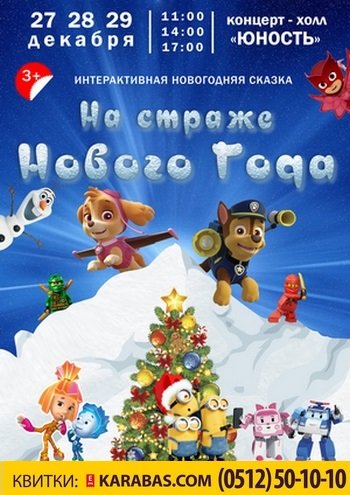 Авторы спектакля объединили 8 самых популярных и любимых мульфильмов, и получилось увлекательное новогоднее шоу, в котором задействовано большое количество персонажей. Отважные Лего Ниндзяго, помощники Фиксики, веселые Little Pony, спасатели Гонщик и Скай из мультфильма «Щенячий Патруль», отважные робокары Поли и Эмбер, «Герои в масках» и многие другие отправятся в новогоднее путешествие с юнными зрителями в красочном интерактивно-развлекательном шоу «На страже Нового года».