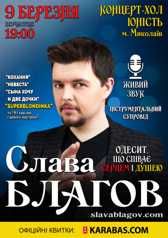 Слава Благов – галантный и экстравагантный , с утончённым вкусом современности , молодой и привлекательный одессит , талантливый поэт , композитор и певец , с уже определённым стилем и направлением в искусстве покорять Сердца Поклонниц , отправляется в концертный тур в сопровождении бэнда , в живое исполнение которого вносит своеобразный музыкальный колорит молодой и талантливый баянист Украины – Владимир Войцеховский. Песни талантливого исполнителя многие слышали на радиостанциях страны и в интернете , но зачастую слушатели не знают своих кумиров в лицо. Единственный исполнитель в Украине , чья песня «По улицам Высоцкого» является достоянием всемирно-известных музеев им. В.Высоцкого в США и Польше. Свадебный хит «Невеста», дуэтная песня с группой «Дюна» «Дорога домой», известная песня в дуэте с Михаилом Грицканом « Поворот» , песни «Золотая», «Кохання», «Мама» и конечно же Премьера : Хит этого года – «SUPERBLONDINKA». Ждём Вас на концертах Славы Благова , где Вы получите максимум положительных эмоций и позитива, слушая песни , которые поются Сердцем и Душой очаровательного одессита !