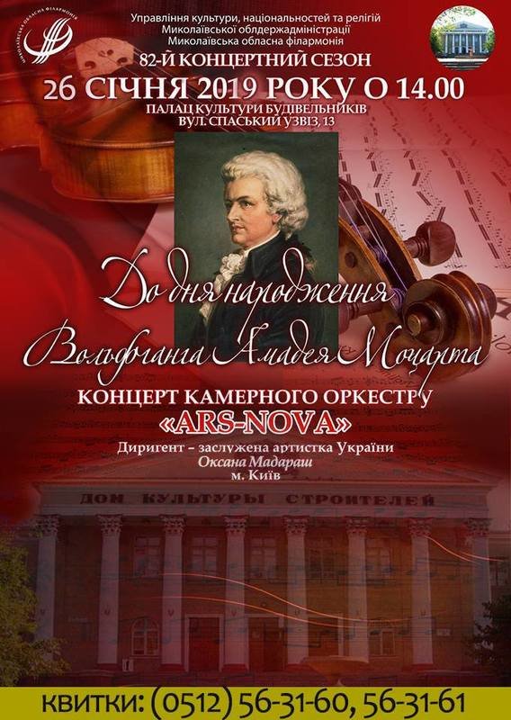 Не пропустіть концерт цілющої музики В.А.Моцарта від кращого камерного оркестру "Ars-Nova", диригент, заслужена артистка України Оксана Мадараш.