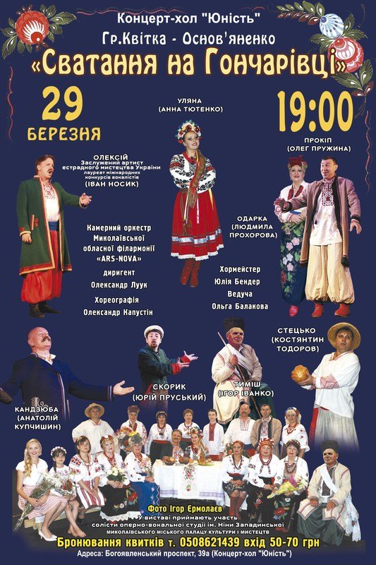 Лорогие друзья по многочисленным просьбам оперно-вокальная студия им.Нины Западинской повторяет спектакль "Сватовство на гончаровке" Это искромётная комедия,которая давно вошла уже в золотой фонд украинской оперно-вокальной классики, оперетта наполнена лёгким юмором и красивыми лирическими сценами. Главные роли исполнят ведущие солисты оперно-вокальной студии. Режиссер спектакля - лауреат международных конкурсов, художественный руководитель оперно-вокальной студии им.Нины Западинской, Заслуженный артист эстрадного искусства Украины Иван Носик.