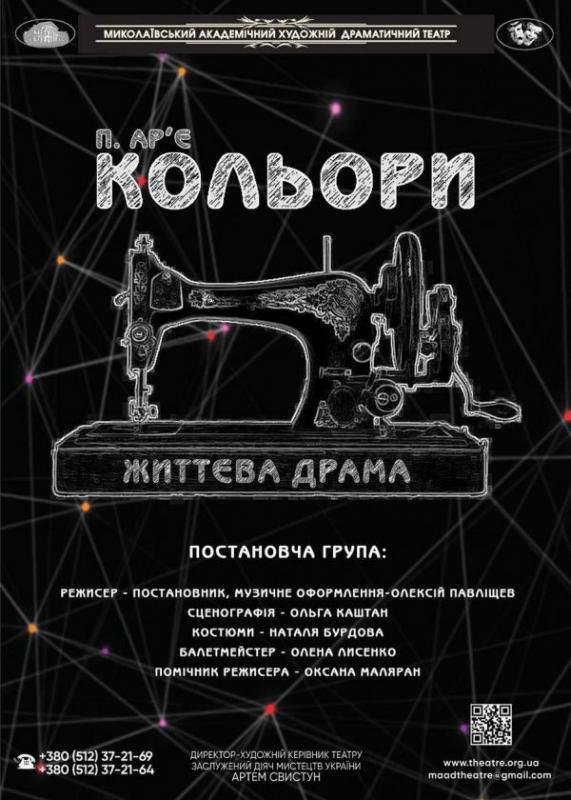 Героїні вистави за п’єсою сучасного українського драматурга Павла Ар’є «Кольори» – п’ять жінок різного віку, статку, світогляду, способу життя, соціального статусу. У кожної з них – свій яскравий характер, свої бажання, мрії. І кожна не сприймає інших – таких несхожих на неї, незрозумілих… На сцені ви побачите життєву драму. Готові до своєрідного експерименту з дослідження жіночої психології? Тоді до зустрічі у театрі!