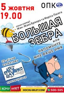 Вистава Большая зебра или напомните мне ваше имя" - це яскрава комедія за п;єсою Жан-Жака Брікера та Моріса Ласега. Життя смугасте як зебра - смуга чорна, смуга біла. Інодідуже складно передбачити коли закінчиться одна та почнеться інша. Аби позбутисядружини, почуття до якої зійшли нанівець, герой вигадує блискучу, на його погляд, аферу звласним життям. Але як завжди все таємне стає відомим...і на героя насувається чорнасмуга. А далі? Далі починається найцікавіше! А також багато веселого сміху для усіхглядачів вистави.