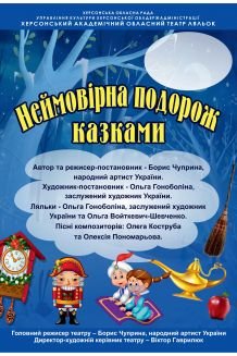 Наш спектакль о том, как к детскому театру попадает современная девушка.Она не верит в сказки и чудеса, но именно за кулисами сказочного театра ейслучилось встретиться с героями известных сказок: Золушкой, Мари иЩелкунчика, Принцессой и Аладином, Белоснежкой и гномами ..Изменила свой взгляд девочка на чудеса в этом мире, вы узнаетепосмотрев наш спектакль под названием "Необычное путешествие сказками". Автор и режиссер-постановщик - Борис Чуприна, народный артист УкраиныХудожник-постановщик - Ольга Гоноболина, заслуженный художник УкраиныКуклы - Ольга Гоноболина, заслуженный художник Украины и Ольга Войткевич-Шевченко.Песни композиторов: Олега Коструба и Алексея Пономарева.