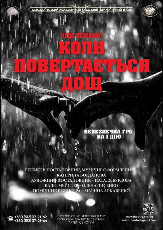 Дивне місто, дивні події, дивні люди… До чого призводять ігри, коли у центрі розваг – люди, які не розуміють, що є частиною якогось веселого плану, добре продуманої інтриги? І чи завжди експерименти над оточуючими завершуються так, як бажалося їх організаторам? Дізнаєтесь з нової вистави театру «Коли повертається дощ» за п’єсою сучасного українського драматурга Неди Нежданої.