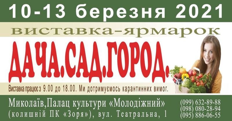 ТОВ «Виставковий центр «НИК» запрошує Вас відвідати 10 - 13 березня 2021 року виставку-ярмарок «Дача. Сад. Город» у Миколаєві.
