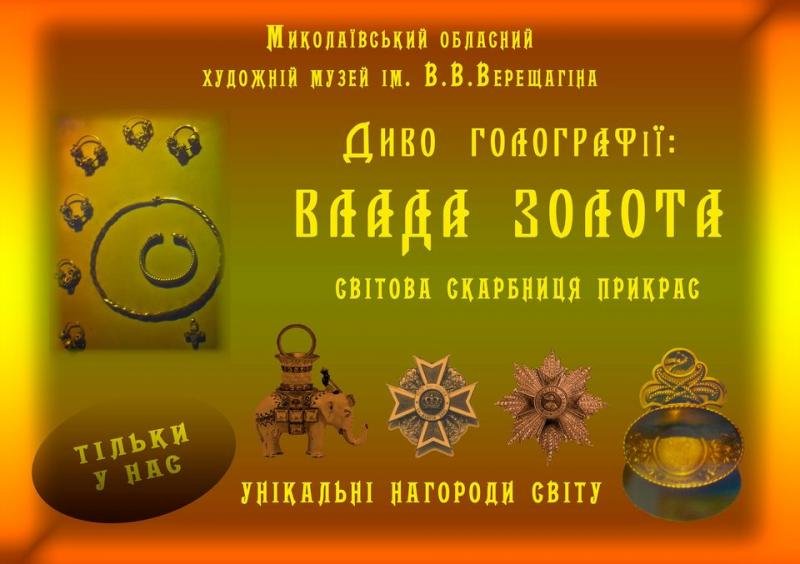 Николаевский областной художественный музей им. В.В. Верещагина приглашает горожан на выставку «Чудо голографии: власть золота», что демонстрирует 30 голограмм. На плоской фотопластинке в объеме перед зрителями предстают предметы фалеристики (западноевропейские, японские, российские, советские и другие ордена) и предметы декоративно-прикладного искусства. Дополняет голографические золотые предметы ряд произведений живописи