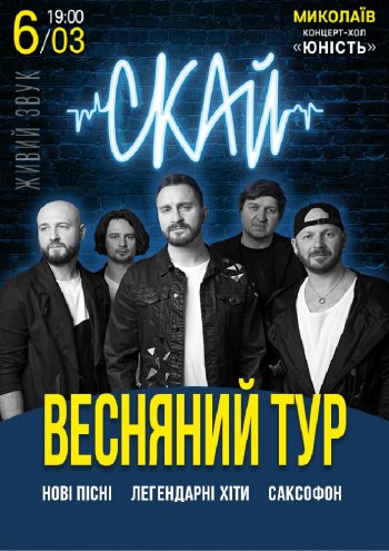 Запрошуємо вас приєднатися до нас у захоплюючому весняному турі гурту "Скай", що обіцяє принести море музичних емоцій та вразити новими звучаннями. Цього разу до складу програми було додано витончений саксофон, який додасть особливу атмосферу та неповторний шарм кожному виступу!