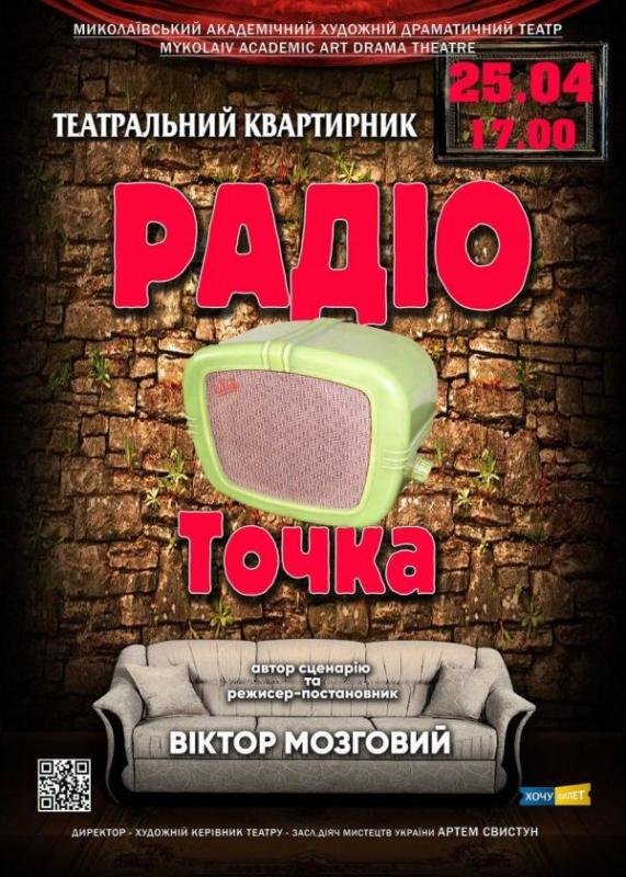 Новий театральний квартирник "РАДІОточка " присвячений 100-річчю українського радіо. У центрі сюжету - позаштатна ситуація: керівництво і провідні ведучі поїхали відзначати свято (власне, 100-річчя радіо), а ефір залишила на малодосвідченого колегу. Влучний гумор, яскраві персонажі, музичні номери - усе це талановито переплетено в сценічній дії. Заінтриговані? Чекаємо на квартирнику.