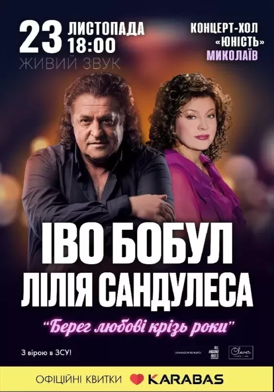 Концерт «Іво Бобул та Лілія Сандулеса «Берег любові через роки» у Миколаєві!