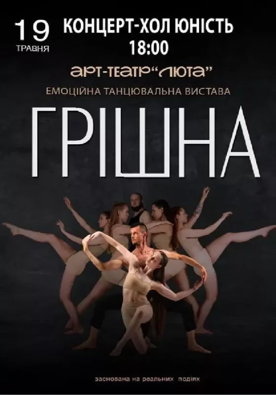 Танцювальна вистава «Грішна» від Арт-Театр «Люта» -це стильна, сучасна і приголомшливо відверта вистава про помилки та каяття, про торги із власною совістю, боротьбу з людським осудом та тонку межу між безчестям та власним щастям. Про грішну любов і одвічне питання «чи насправді краще двоє щасливих ніж троє нещасних?».