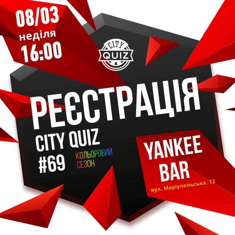Продовжуємо кольоровий сезон! Приймає нас, Yankee Bar Хто не знайомий: Що таке City Quiz? Це інтелектуально-розважальне шоу під час якого ваша команда відповідає на різні питання. Це схоже одночасно на "Брейн-рінг" та "Що? Де? Коли?" На вас чекають 8 тематичних раундів з 10 питань (текст, фото, відео, музика). Ведучий зачитує питання, які з'являються на екранах, а учасники дають відповіді. Після зданих командами відповідей, ведучий оголошує правильні відповіді, а команди отримують бали.