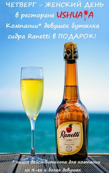 Компанию девушек ждет приятный сюрприз - бутылка сидра Ranetti в подарок! Акция действительна для компании из 4-ех и более девушек. Контактный телефон: (093) 034-34-34.